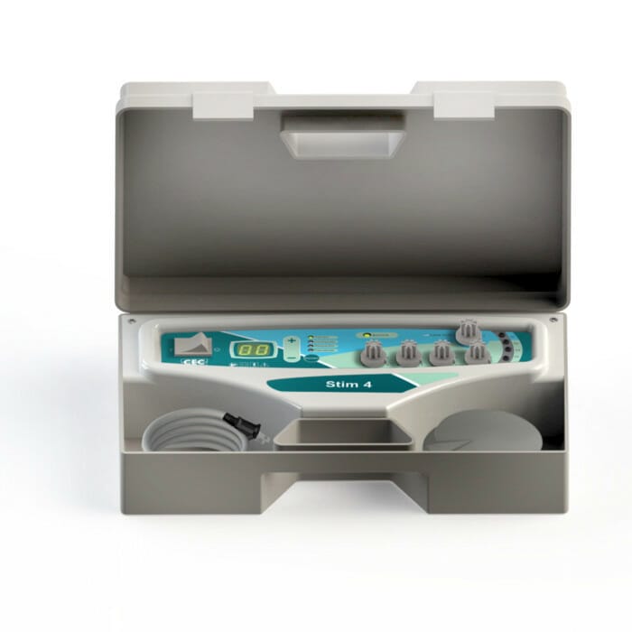 Ondas rusas. 4 canales corporales, 1 canal facial. Portátil para atención domiciliaria. Stim4 es un electroestimulador portátil de ondas rusas para uso en estética y fisioterapia, práctico y liviano, desarrollado para atención domiciliaria. Óptimo para gimnasia pasiva y activa-asistida, fortalecimiento, recuperación muscular e hipertrofia de cualquier músculo normalmente inervado.